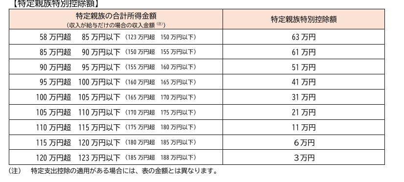 特定親族にあたる扶養親族の合計所得金額に応じて段階的に特別控除が受けられるというものです。