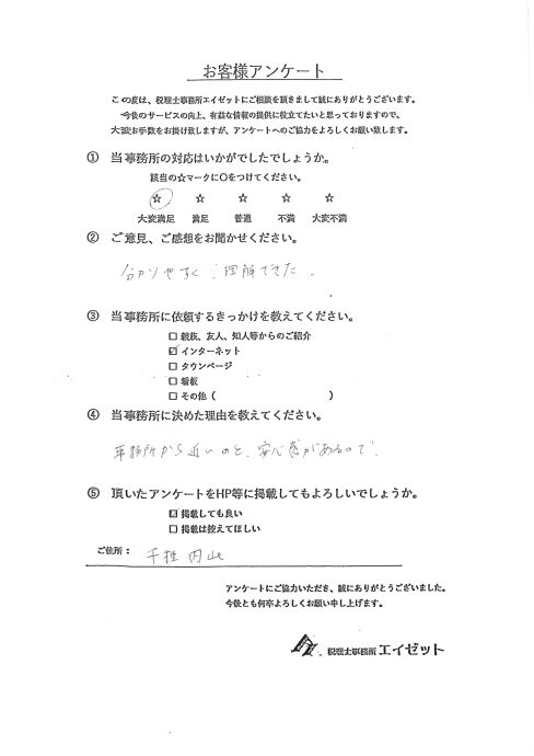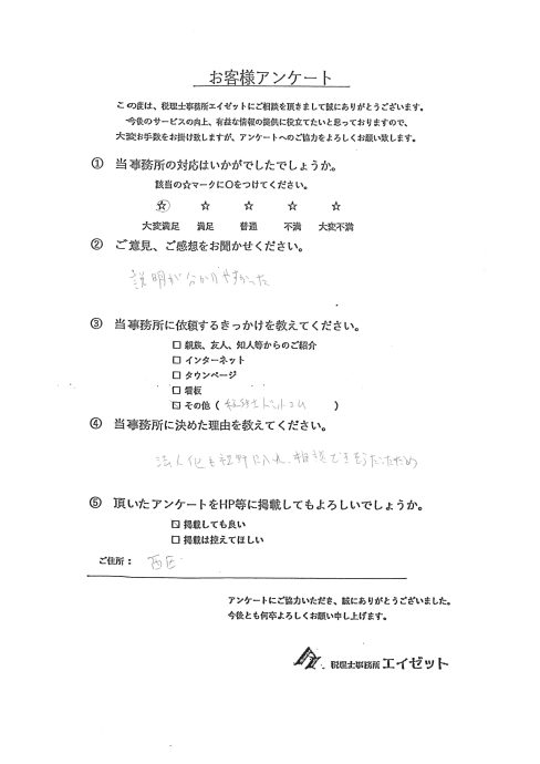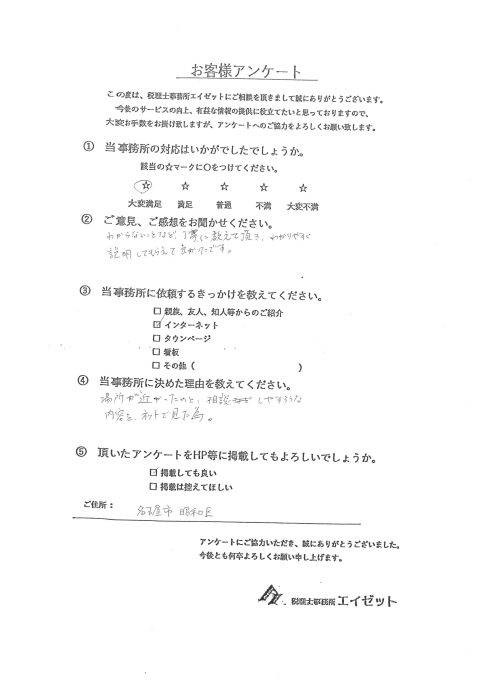 235【お客様の声】名古屋市昭和区 飲食業 1当事務所の対応はいかがだったでしょうか 大変満足 2ご意見、ご感想をお聞かせ下さい わからないことなど、丁寧に教えて頂き、 わかりやすく説明してもらえて、良かったです。 3当事務所に依頼するきっかけは何でしたか インターネット 4当事務所に決めた理由は何でしたか 場所が近かったのと、相談しやすそうな内容を ネットで見た為。 クリックで拡大します 234【お客様の声】名古屋市西区 電気工事業 1当事務所の対応はいかがだったでしょうか 大変満足 2ご意見、ご感想をお聞かせ下さい 説明が分りやすかった。 3当事務所に依頼するきっかけは何でしたか 税理士ドットコム 4当事務所に決めた理由は何でしたか 法人化も視野に入れ、相談できそうだった為。 クリックで拡大します 233【お客様の声】愛知県刈谷市 映像制作 1当事務所の対応はいかがだったでしょうか 満足 2ご意見、ご感想をお聞かせ下さい これからの対応に期待 3当事務所に依頼するきっかけは何でしたか インターネット 4当事務所に決めた理由は何でしたか 金額、規模感 クリックで拡大します 232【お客様の声】名古屋市千種区 飲食業 1当事務所の対応はいかがだったでしょうか 大変満足 2ご意見、ご感想をお聞かせ下さい 分りやすく、理解できた。 3当事務所に依頼するきっかけは何でしたか インターネット 4当事務所に決めた理由は何でしたか 事務所から近いのと、安心感があるので クリックで拡大します 231【お客様の声】名古屋市 研究職 1当事務所の対応はいかがだったでしょうか 大変満足 2ご意見、ご感想をお聞かせ下さい LINEでの問い合わせでも、すぐに対応頂けるので安心感があります。 これからも引き続き、よろしくお願いいたします。 3当事務所に依頼するきっかけは何でしたか 親族、友人、知人からのご紹介 4当事務所に決めた理由は何でしたか 丁寧に対応いただけたので クリックで拡大します 230【お客様の声】愛知県刈谷市 建設業 1当事務所の対応はいかがだったでしょうか 大変満足 2ご意見、ご感想をお聞かせ下さい 3当事務所に依頼するきっかけは何でしたか インターネット 4当事務所に決めた理由は何でしたか 対応が丁寧だったから クリックで拡大します 229【お客様の声】名古屋市 パン製造・販売 1当事務所の対応はいかがだったでしょうか 大変満足 2ご意見、ご感想をお聞かせ下さい 詳しく分かりやすく説明して頂いて、有難かったです。 3当事務所に依頼するきっかけは何でしたか 親族、友人、知人からのご紹介 4当事務所に決めた理由は何でしたか 母親の知人がいらっしゃったからです。 クリックで拡大します 228【お客様の声】名古屋市 アパレル事業 1当事務所の対応はいかがだったでしょうか 大変満足 2ご意見、ご感想をお聞かせ下さい 期待をしています。末永く宜しくお願いします。 3当事務所に依頼するきっかけは何でしたか インターネット 4当事務所に決めた理由は何でしたか 信頼出来ると感じたこと。 クリックで拡大します 227【お客様の声】名古屋市 不動産業 1当事務所の対応はいかがだったでしょうか 大変満足 2ご意見、ご感想をお聞かせ下さい わかりやすい説明をしていただいて、ありがたいです。 3当事務所に依頼するきっかけは何でしたか 親族、友人、知人等からのご紹介 4当事務所に決めた理由は何でしたか クリックで拡大します 226【お客様の声】名古屋市 エステ業 1当事務所の対応はいかがだったでしょうか 大変満足 2ご意見、ご感想をお聞かせ下さい 3当事務所に依頼するきっかけは何でしたか 親族、友人、知人からのご紹介 4当事務所に決めた理由は何でしたか スタッフが若いから クリックで拡大します