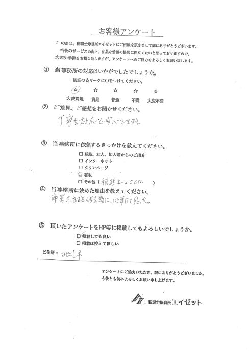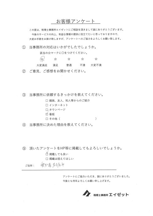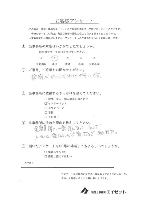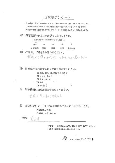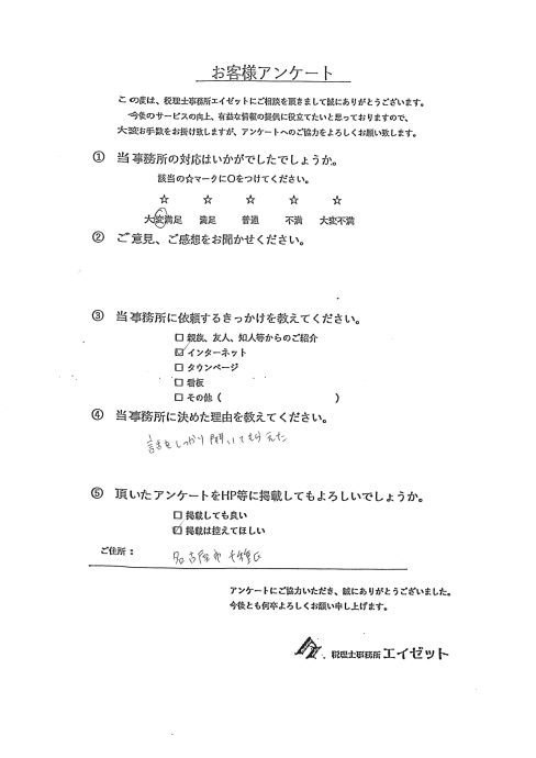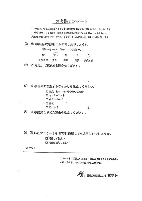 242【お客様の声】愛知県名古屋市 民泊業 1当事務所の対応はいかがだったでしょうか 大変満足 2ご意見、ご感想をお聞かせ下さい 3当事務所に依頼するきっかけは何でしたか 親族、友人、知人からのご紹介 4当事務所に決めた理由は何でしたか お人柄、スピード、やり取りのスムーズさ クリックで拡大します 241【お客様の声】愛知県刈谷市 型枠工 1当事務所の対応はいかがだったでしょうか 満足 2ご意見、ご感想をお聞かせ下さい 説明が、ゆっくりで分りやすいです。 3当事務所に依頼するきっかけは何でしたか インターネット 4当事務所に決めた理由は何でしたか 金額等に一番気になっていたので、 メールに書き込んで有ったので、きめました。 クリックで拡大します 240【お客様の声】愛知県豊田市 通信業 1当事務所の対応はいかがだったでしょうか 満足 2ご意見、ご感想をお聞かせ下さい 3当事務所に依頼するきっかけは何でしたか インターネット 4当事務所に決めた理由は何でしたか クリックで拡大します 239【お客様の声】愛知県名古屋市 造園業 1当事務所の対応はいかがだったでしょうか 大変満足 2ご意見、ご感想をお聞かせ下さい 3当事務所に依頼するきっかけは何でしたか インターネット 4当事務所に決めた理由は何でしたか 話をしっかり聞いてもらえた。 クリックで拡大します 238【お客様の声】愛知県名古屋市 営業代行業 1当事務所の対応はいかがだったでしょうか 大変満足 2ご意見、ご感想をお聞かせ下さい 3当事務所に依頼するきっかけは何でしたか 看板 4当事務所に決めた理由は何でしたか クリックで拡大します 237【お客様の声】愛知県みよし市 飲食業 1当事務所の対応はいかがだったでしょうか 大変満足 2ご意見、ご感想をお聞かせ下さい 丁寧な対応で安心できます。 3当事務所に依頼するきっかけは何でしたか 税理士ドットコム 4当事務所に決めた理由は何でしたか 事業を大きくする為に、必要だと思った。 クリックで拡大します 236【お客様の声】 愛知県犬山市 自動車関連 1当事務所の対応はいかがだったでしょうか 大変満足 2ご意見、ご感想をお聞かせ下さい 説明が丁寧でわかりやすく、お任せできると感じました。 3当事務所に依頼するきっかけは何でしたか インターネット 4当事務所に決めた理由は何でしたか 料金・内容がわかりやすかった。 クリックで拡大します 235【お客様の声】名古屋市昭和区 飲食業 1当事務所の対応はいかがだったでしょうか 大変満足 2ご意見、ご感想をお聞かせ下さい わからないことなど、丁寧に教えて頂き、 わかりやすく説明してもらえて、良かったです。 3当事務所に依頼するきっかけは何でしたか インターネット 4当事務所に決めた理由は何でしたか 場所が近かったのと、相談しやすそうな内容を ネットで見た為。 クリックで拡大します 234【お客様の声】名古屋市西区 電気工事業 1当事務所の対応はいかがだったでしょうか 大変満足 2ご意見、ご感想をお聞かせ下さい 説明が分りやすかった。 3当事務所に依頼するきっかけは何でしたか 税理士ドットコム 4当事務所に決めた理由は何でしたか 法人化も視野に入れ、相談できそうだった為。 クリックで拡大します 233【お客様の声】愛知県刈谷市 映像制作 1当事務所の対応はいかがだったでしょうか 満足 2ご意見、ご感想をお聞かせ下さい これからの対応に期待 3当事務所に依頼するきっかけは何でしたか インターネット 4当事務所に決めた理由は何でしたか 金額、規模感 クリックで拡大します